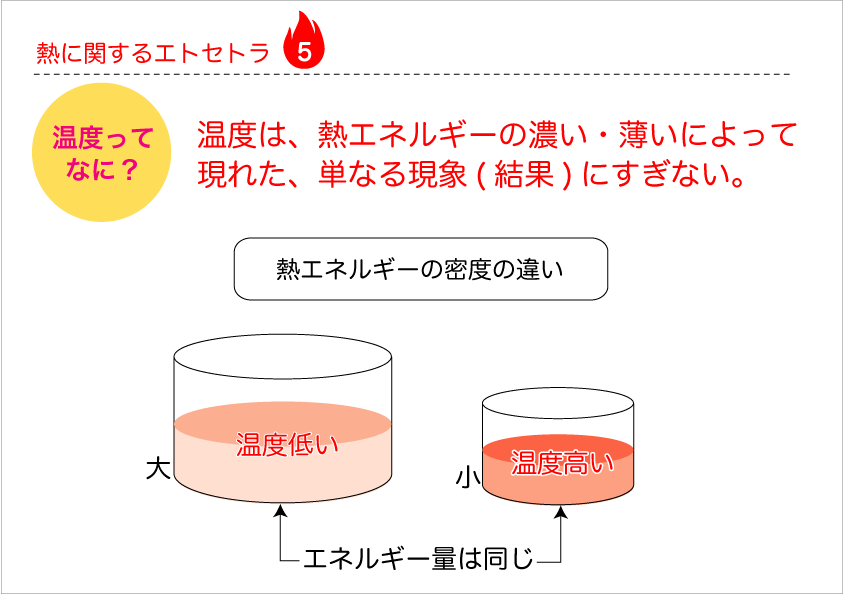 別の言い方をすれば、温度は熱い、冷たいといった『熱の強さ』を数値で示したものです。